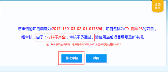 项目单位点击“修改申报”,会提示回退的原因,再点击“修改申报”按钮,从【回答问题】处开始重新申报。