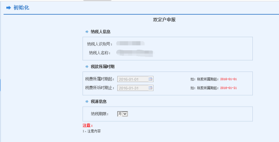 A、依次点击菜单【申报缴税】—【纳税申报】—【双定户申报】—【申报】进入双定户申报初初始化界面。
