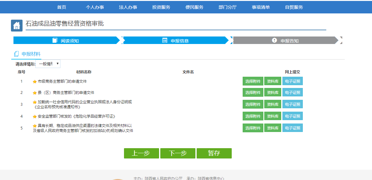 11.上传申报材料,带的材料为必要材料,材料可以点击“选择附件”从本地上传,也可点击“资料库”选择当前账户之前上传过的电子材料,还可从“电子证照”中选择西安服务网申报产生的证照信息。