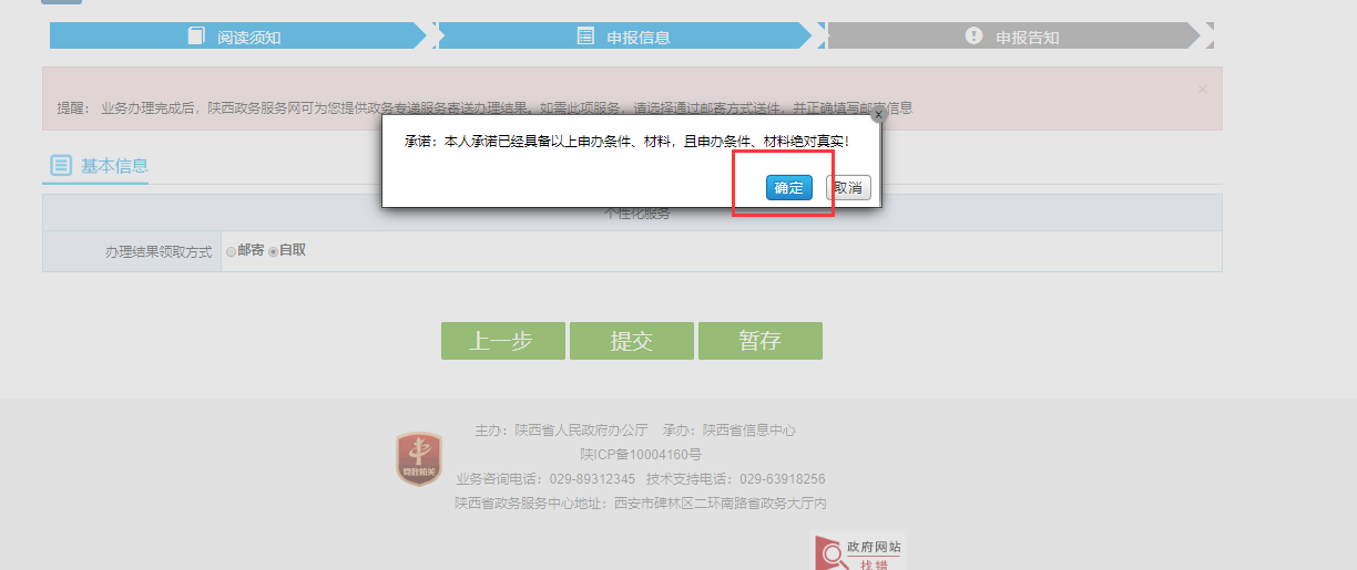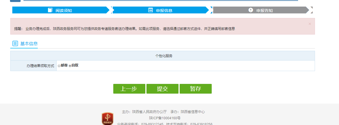 12.申报信息,选择结果领取方式,可以选择自取或邮寄,如果选择邮寄则需填写邮寄地址。