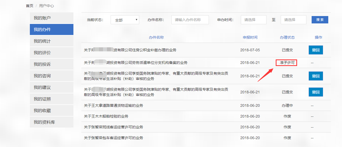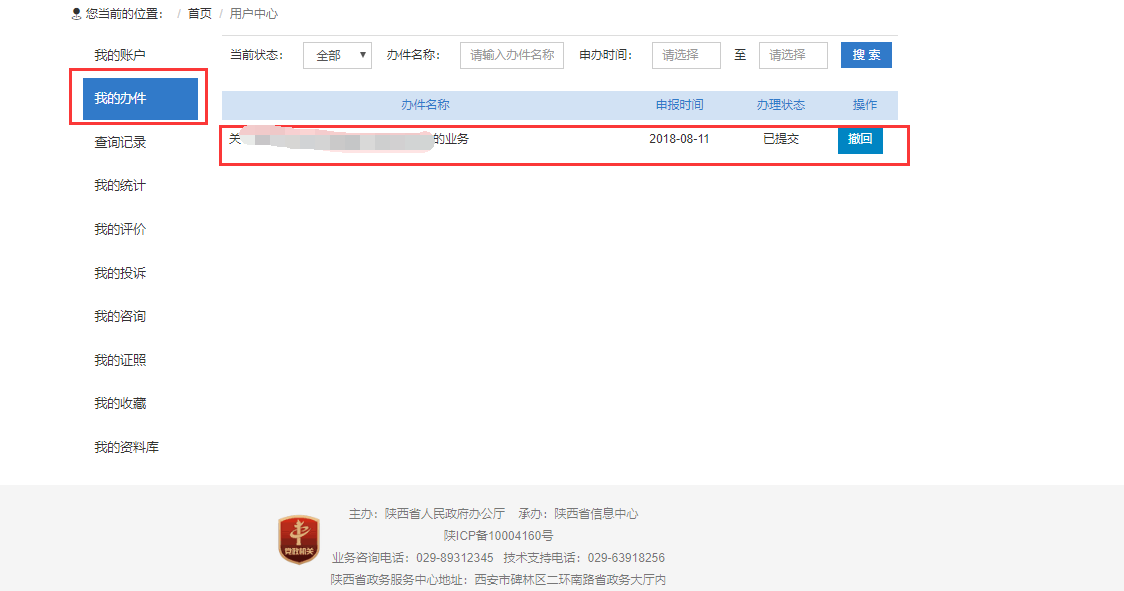 15.查询办理进度,点击右上角“用户中心”查看我的办件,可以查询当前用户申报的业务详情。