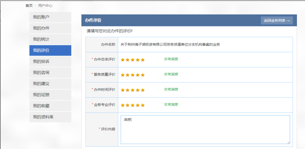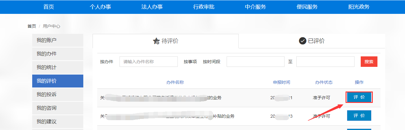 18.点击用户中心-我的评价可对已办结的件进行办件评价。
