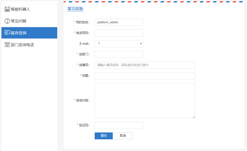 19.可通过两种途径进行在线咨询:(1)主页中点击“我要咨询”进入咨询界面。(2)在主页中“我要问”-“我要咨询”进入咨询界面。填写信息完成后,点击提交。