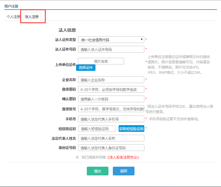 注意:因目前实名认证调用国家法人库的验证权限有限,如遇到注册时提示“数据提交失败”,请与技术热线(029-86785201)联系进行人工注册。