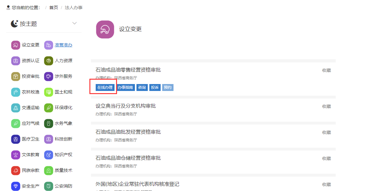 7.在办事指南页面可以查看受理条件、申请材料、办理时限、下载样表/空白表格等,点击“在线办理”按钮进行申报。