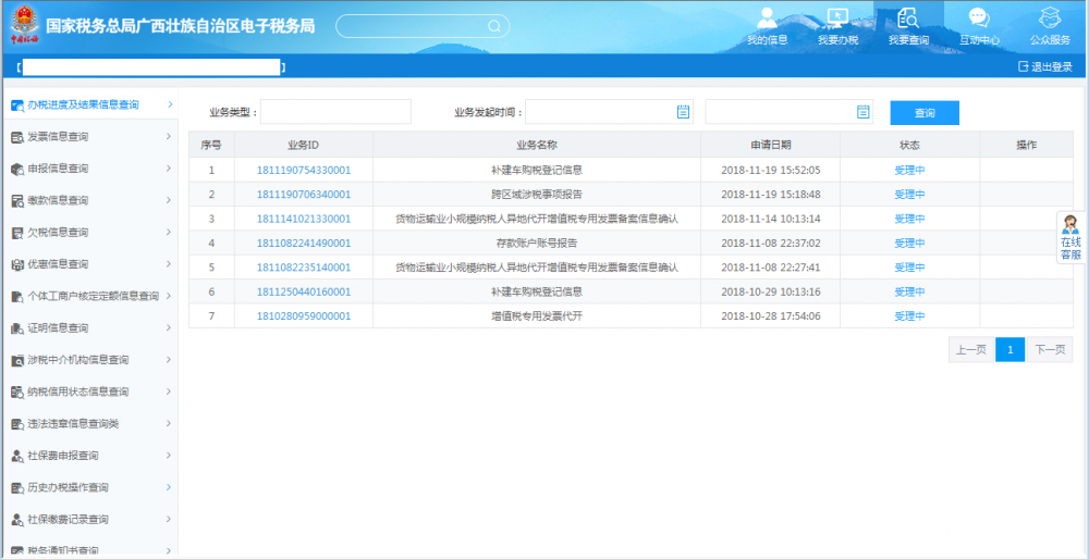 业务提交后,可通过右上角【我要查询—办税进度及结果信息查询】,查看该业务办理进度及业务状态: