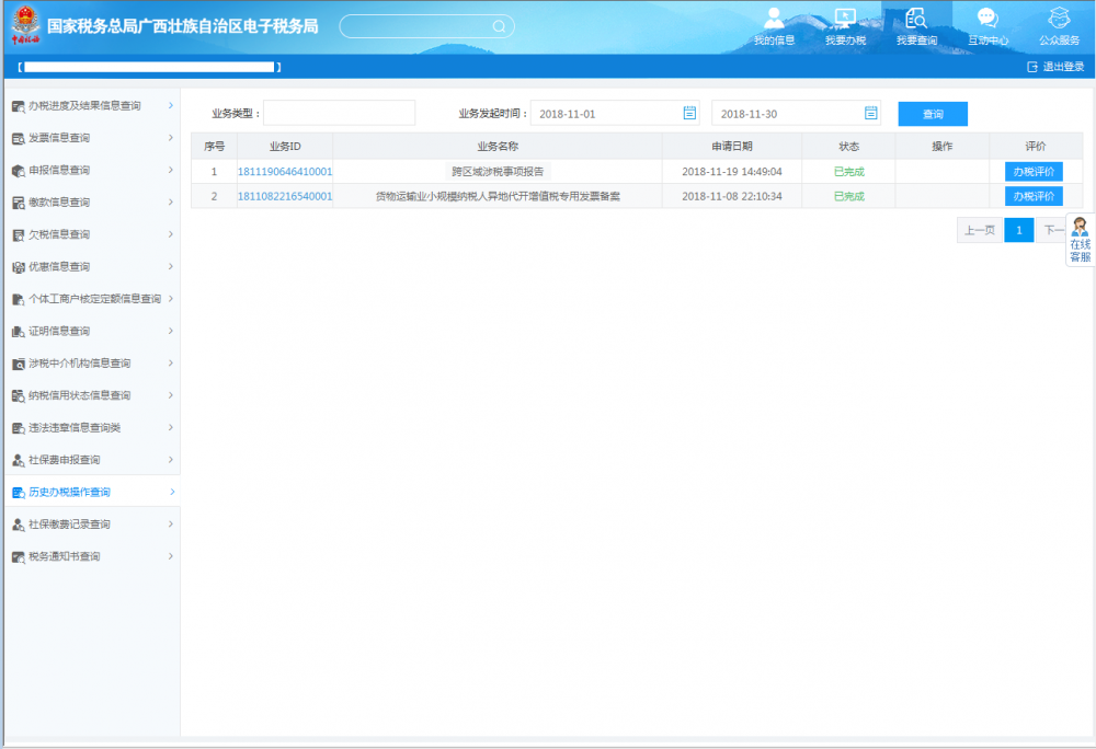 业务办结后,可通过右上角【我要查询—历史办税操作查询】,查看企业已经办理完成的业务(即状态为已完成、已作废的业务),如下:
