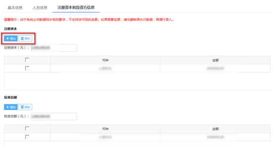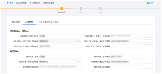 可变更项目分为“基本信息”、“人员信息”、“注册资本和投资方信息”3个页签展示。其中,基本信息包括纳税人基本情况信息,人员信息包括法人(负责人)相关信息变更和财务负责人相关信息变更,注册资本和投资方信息包括注册资本、投资总额和投资方信息等信息变更。