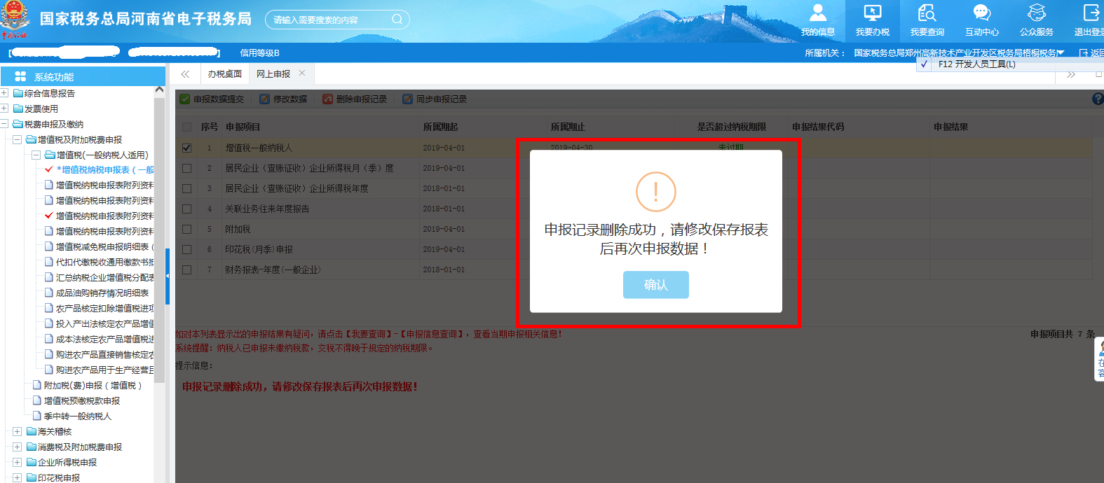 【删除申报记录】,在申报成功未扣款的情况下,如果发现数据有误,点击【删除申报记录】按钮,将作废已申报数据,作废后可以对报表数据进行修改作废成功如下图所示: