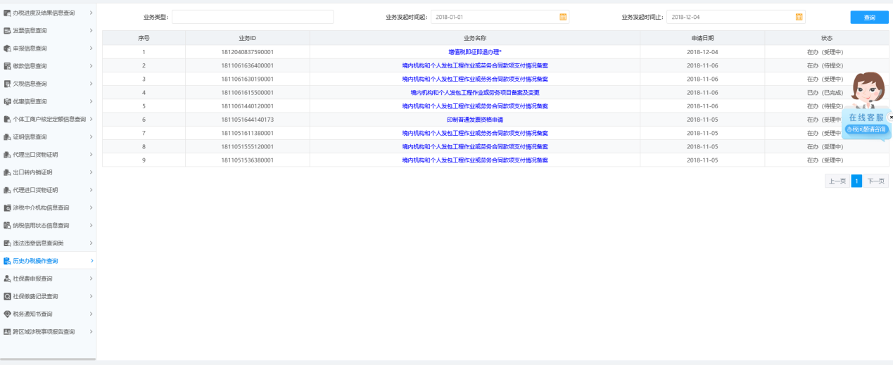 业务办结后,可通过【历史办税操作查询】,查看企业已经办理完成的业务(即状态为已完成、已作废的业务),如下: