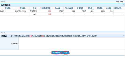 三、系统自动带出销货方纳税人基本信息。填写购货方信息以及货物劳务信息,点击【计算附加税】计算出纳税人本次代开应纳税款信息,确认无误后点击页面底部【下一步】。