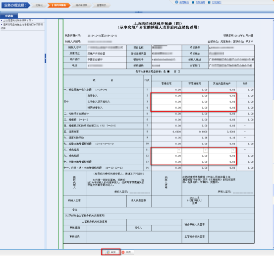 2、点击,进入《土地增值税纳税申报表(四)(从事房地产开发的纳税人清算后尾盘销售适用)》填写申报数据。(填写规则与纸质报表完全相同)。填写完成后,点击