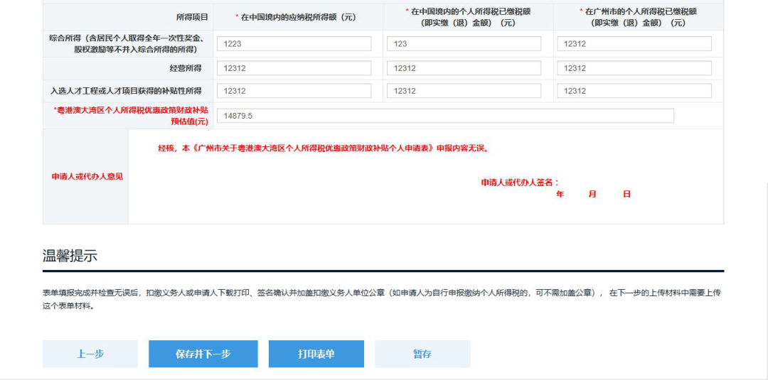 表单填报完成并检查无误后,扣缴义务人或申请人下载打印、签名确认并加盖扣缴义务人单位公章(如申请人为自行申报缴纳个人所得税的,可不需加盖公章),在下一步的上传材料中需要上传这个表单材料。