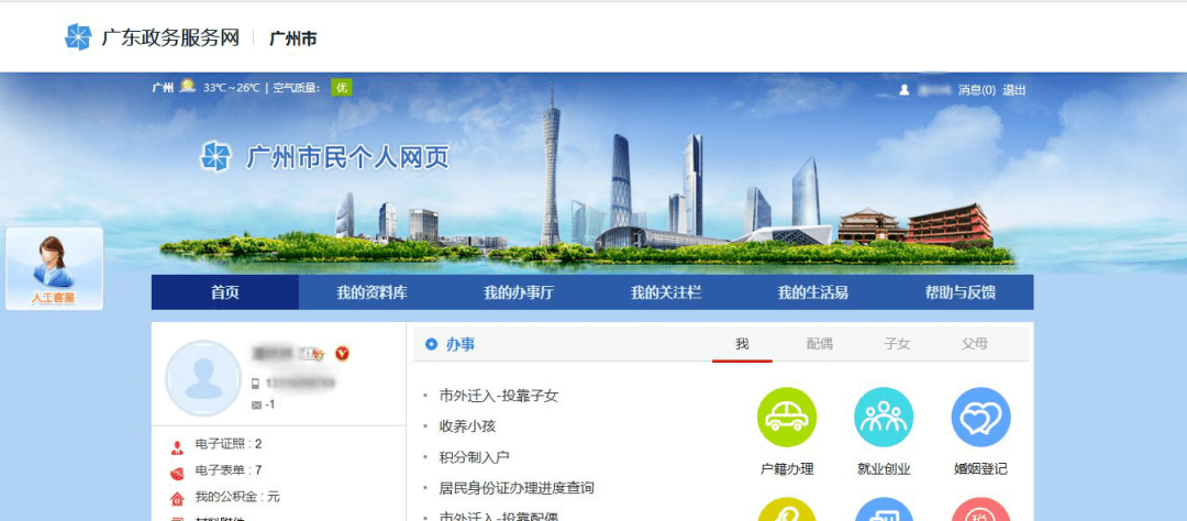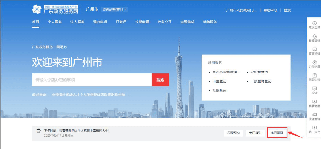 访问广东政务服务网,点击首页里的市民网页,如下图: