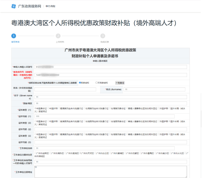 申请人填写完纳税识别号、查询序列号后,关于 “授权系统从电子税务局获取个人所得税缴纳汇总数据”这一栏申请人需 勾选 “同意授权”,并 点击“个税查询”按钮,才能进行后面内容的填写,如“不同意授权”将无法完成表单填写。