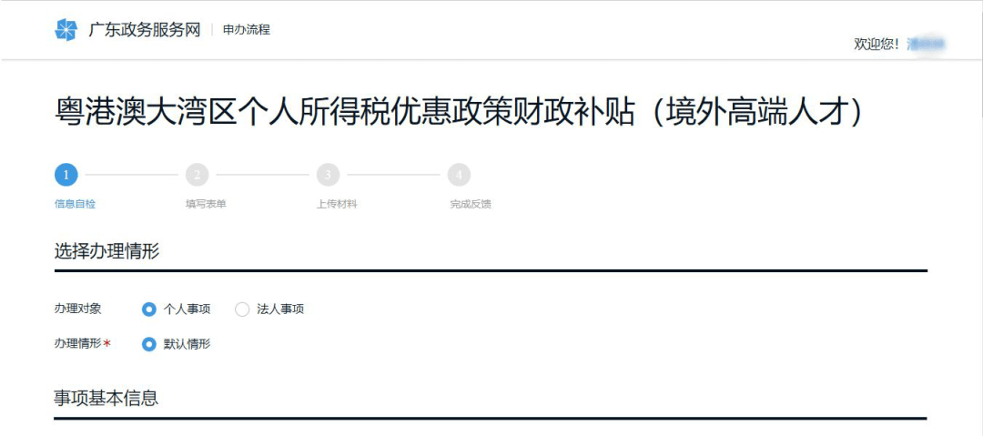 登录后,进入申办流程,申办流程环节包括 1、信息自检——2、填写表单——3、上传材料——4、完成反馈