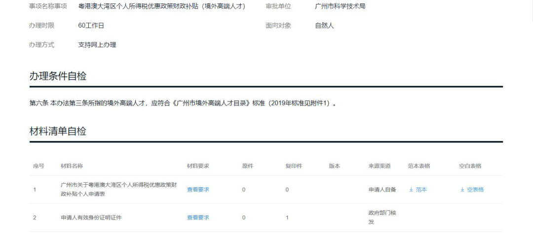 以“粤港澳大湾区个人所得税优惠政策财政补贴(境外高端人才)https://www.95ye.com/shop/24335.html”申办为例,点击搜索结果,如下图: