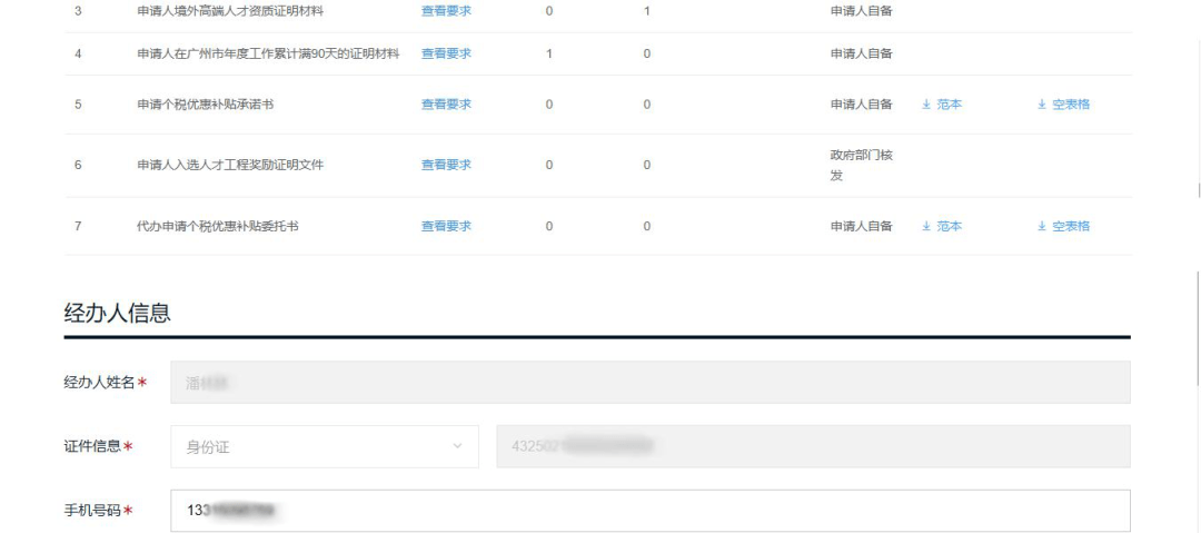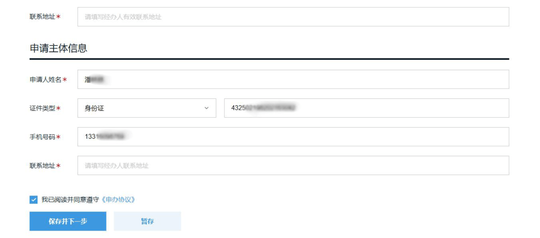 信息自检页,申请人对照要求是否有准备好相关材料,并填写经办人和申请主体信息的联系地址