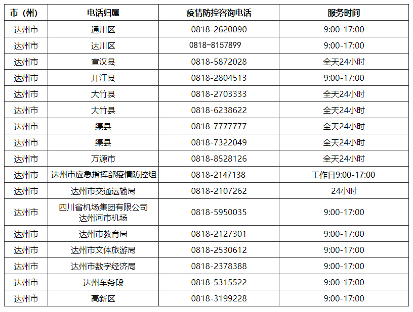 达州市新冠疫情防控指挥部咨询电话:0818-2620090;