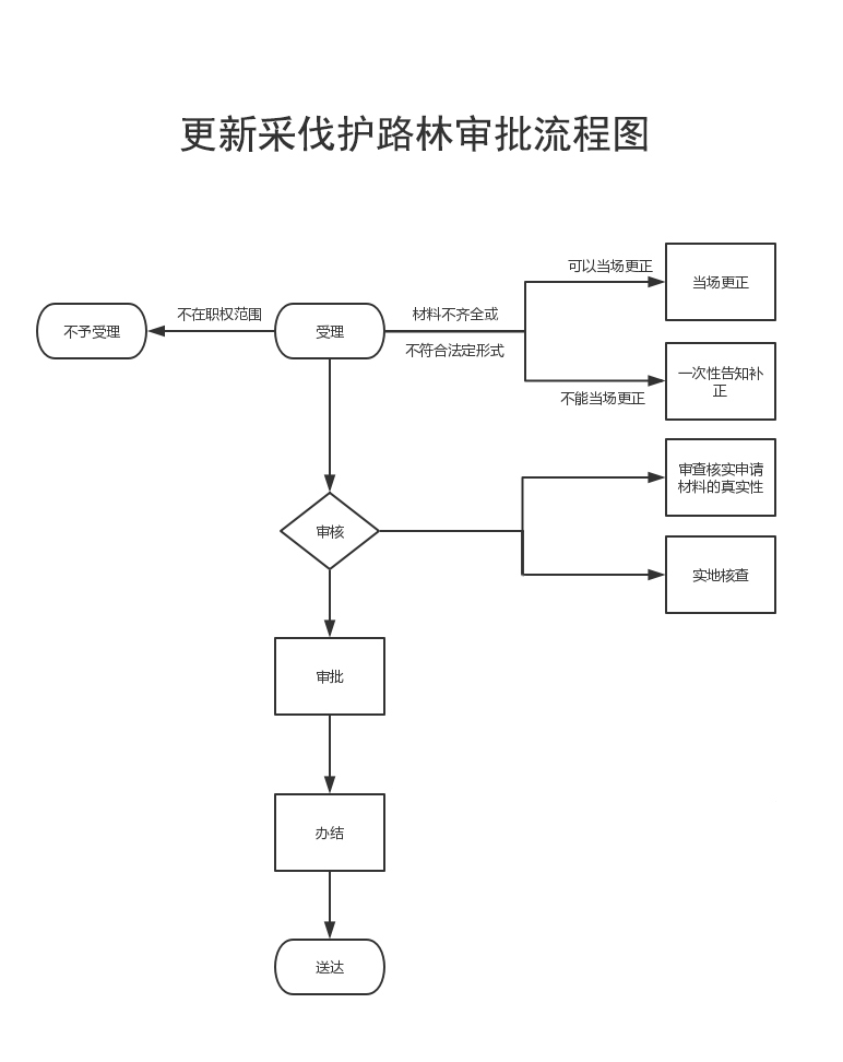 受理条件: 1、符合《公路法》公路法(1997年7月3日第八届全国人民代表大会常务委员会第二十六次会议通过,2017年11月4日修改)第四十二条第二款 公路绿化工作,由公路管理机构按照公路工程技术标准组织实施。公路用地上的树木,不得任意砍伐;需要更新砍伐的,应当经县级以上地方人民政府交通主管部门同意后,依照《中华人民共和国森林法》的规定办理审批手续,并完成更新补种任务的情形;符合《公路安全保护条例》(2011年国务院令第593号)第二十六条 禁止破坏公路、公路用地范围内的绿化物。需要更新采伐护路林的,应当向公路管理机构提出申请,经批准方可更新采伐,并及时补种;不能及时补种的,应当交纳补种所需费用,由公路管理机构代为补种的情形; 2、更新砍伐公路用地上的树木的许可的确有必要; 3、 更新砍伐公路用地上的树木的许可的符合有关技术标准和规范要求; 4、 应急方案健全; 5、 符合公路安全运行的要求; 5、 影响交通安全的,征求公安机关交通管理部门意见。 |