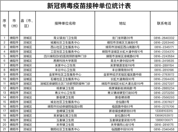绵阳市涪城区新冠病毒疫苗接种点信息