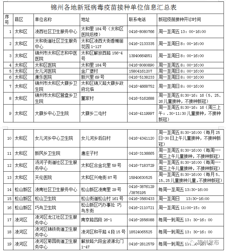 即日起,锦州市太和区内18岁以上居民(含60岁以上)不论户籍,身体状况符合接种要求的均需免费接种新冠病毒疫苗,请您与所在单位或社区联系疫苗接种相关事宜。零散居民、流动人口也可携带身份证,就近自行前往接种点接种,接种点会根据疫苗供应情况、日接种能力、排队顺序等发放接种序号。注意;接种点开放时间不定时有调整,建议先电话或者网上预约咨询,太和区新冠病毒疫情防控热线电话:0416-2626333;锦州市太和区新冠病毒疫苗接种单位名单、地址、接种时间和预约电话等相关信息请看这里↓↓↓