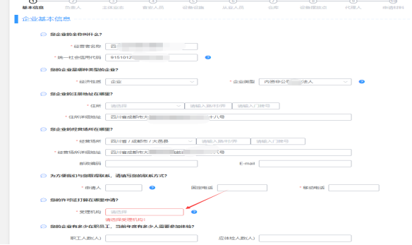 (4) 企业填写申请信息选择受理机构时,如果为特殊食品许可的办理只能选择四川省市场监督管理局;如果为非特殊食品可根据企业生产地址选择对应的xx市市场监督管理局;如果为食品经营企业,则企业选择受理机构时选择对应所在辖区的xx区(县)市场监督管理局。另外,非特殊食品和食品经营许可的受理机构选择以地市实际管理规定为准。