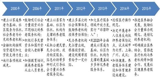2015年,在《关于鼓励民间资本参与养老服务业发展的实施意见》里,提出要鼓励社会力量举办规模化、连锁化的养老机构。对民办养老机构提供的育养服务免征营业税。养老机构在资产重组过程中涉及的不动产、土地使用权转让,不征收增值税和营业税。 在《全国医疗卫生服务体系规划纲要(2015—2020年)》里明确提出医养结合,需推进医疗机构与养老机构等加强合作、发展社区健康养老服务。在《关于推进医疗卫生与养老服务相结合的指导意见》里提出医养结合两大发展目标:到 2017年,初步建立医养结合的政策体系、标准规范和管理制度,逐步提升基层医疗卫生机构提供居家养老上门服务的能力;到 2020年,基本建立符合国情的医养结合体制机制和政策法规体系,80%以上的医疗机构开设为老年人提供绿色通道,50%以上的养老机构能够以不同形式为入住老年人提供医疗卫生服务,基本适应老年人健康养老服务的需求。