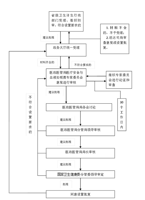 《血站管理办法》(2005年卫生部令第44号)第四十六条:“申请设置脐带血造血干细胞库等特殊血站的,应当按照卫生部规定的条件向所在地省级人民政府卫生行政部门申请。省级人民政府卫生行政部门组织初审后报卫生部。卫生部对脐带血造血干细胞库等特殊血站设置审批按照申请的先后次序进行。”