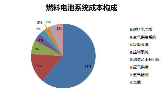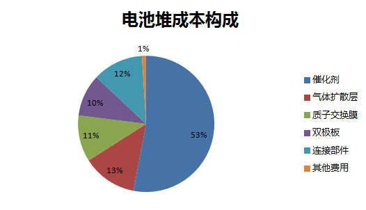 燃料电池系统成本由燃料电池堆、空气供给系统、氢气供给系统、冷却排水系统及电能控制系统等部分组成,其中电池堆成本占比高达61%,电池堆成本则由催化剂、质子交换膜、双极板和气体扩散层组成,其中催化剂成本占比高达53%,其他材料占比较为平均,约为10%左右(本文属于原创,猫视汽车首发,转载请注明)。