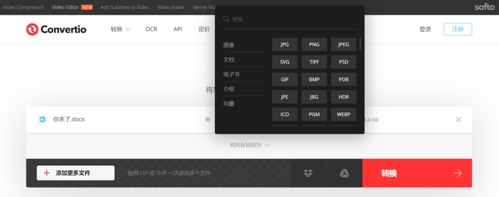 你可以上传任何文件到Convertio进行转换,该在线格式转换网站支持超300种格式,功能包含音频转换、视频转换、图像转换、文档转换、归档转换、演示器、字体转换、电子书转换,以及OCR等,全部功能都可以免费使用。
