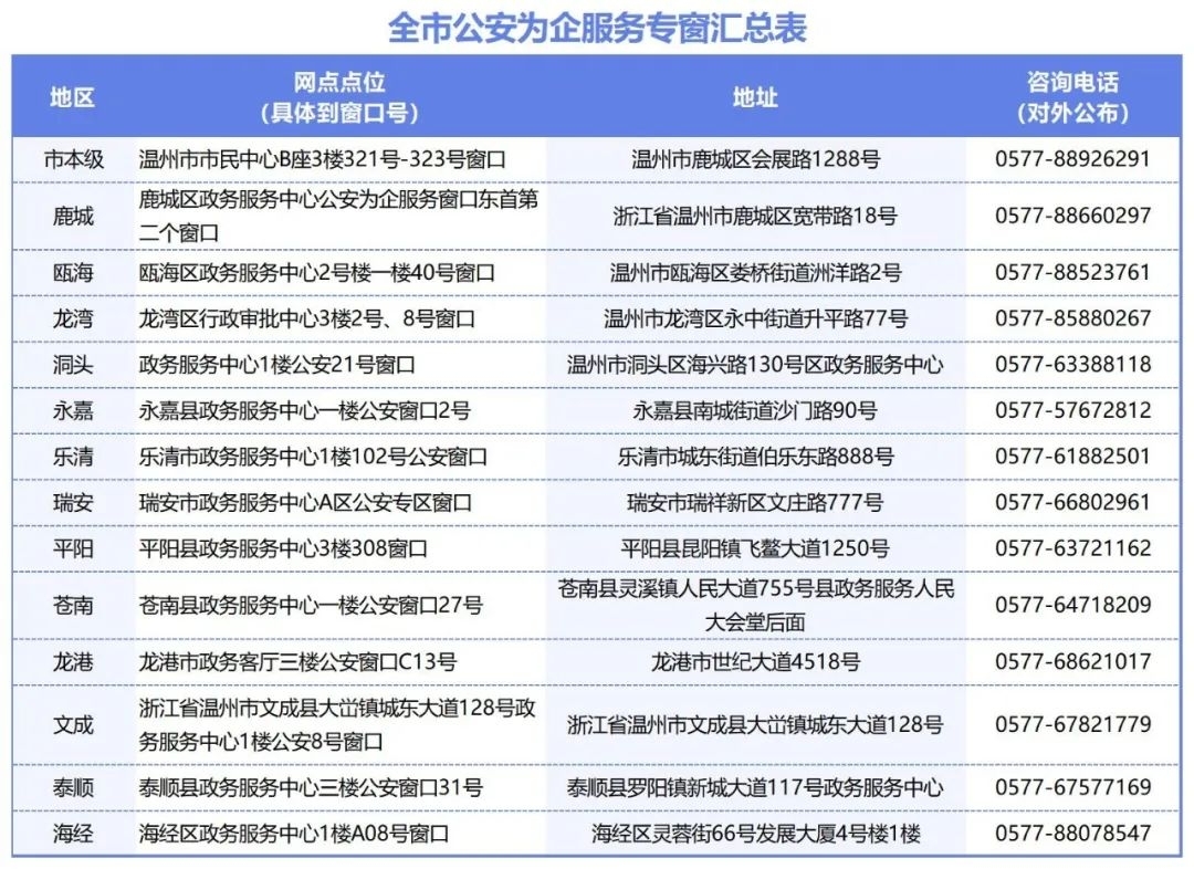 在市民中心B座3楼新设3个公安为企服务专窗,民用枪支持枪证(配置射击运动枪支)核发、爆破作业单位许可证(经营性)核发等51项公安涉企服务业务(点击查看具体业务事项),可在这里集成办理,同时还推出申办帮扶前置、保安公司视频预踏勘、剧毒通行证审批联合办等惠企举措,全面提升企业政务办事环境,助力企业快速走上健康发展轨道。