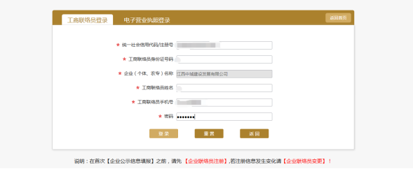 登陆首页面。在首次【企业公示信息填报】之前,请先 【企业联络员注册】,若注册信息发生变化请【企业联络员变更】!