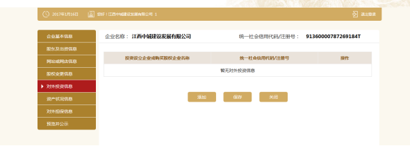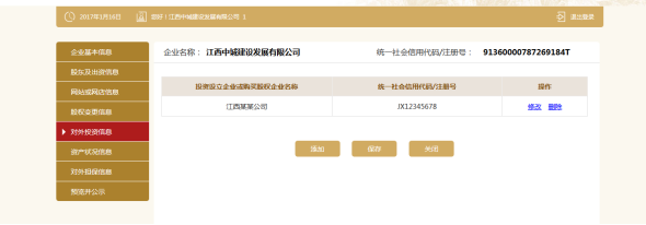 进入对外投资信息页面。可添加多条对外投资信息,也可修改或删除信息。