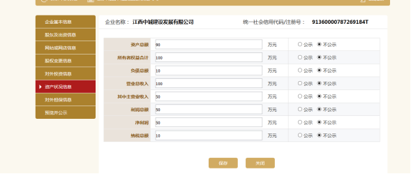 进入资产状况信息页面。注意:1.集团公司请按照母公司报表填报数据,不要使用合并报表数据;2.资产总额应该等于负债总额+所有者权益合计。填写信息,点击保存。