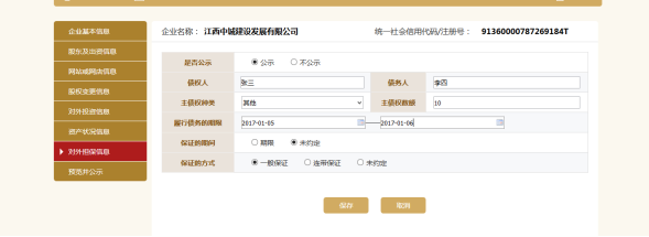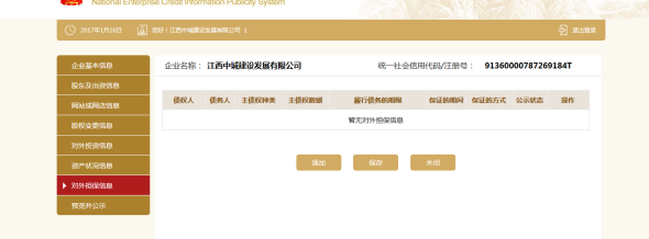 点击添加,填写对外担保信息。点击保存。