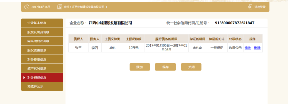 进入对外担保信息页面。可添加多条对外担保信息,也可修改或删除信息。