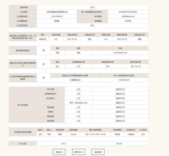 进入预览页面。说明:用户需审查填报内容,可点击“预览打印”;审核无误后点击“提交并公示”。如未点击“提交并公示”,则本年度年度报告公示未完成。