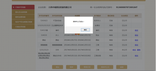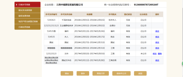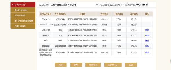 进入行政许可信息页面。可添加多条行政许可信息,也可修改或删除信息。