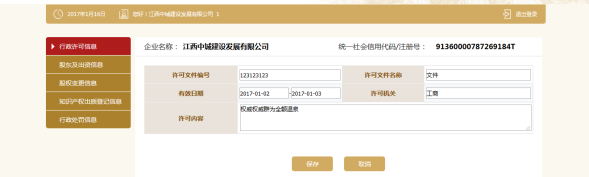 点击添加,填写行政许可信息。点击保存。