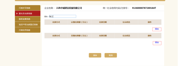 点击添加,填写股东及出资信息,点击保存。