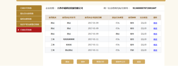行政处罚信息,可添加多条行政处罚信息,也可修改或删除信息。