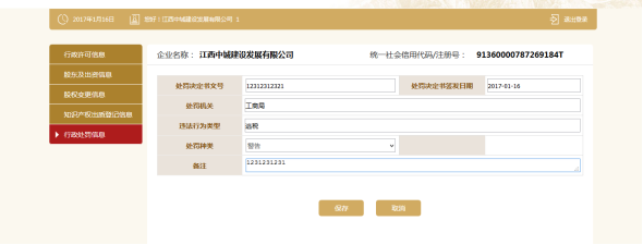 行政处罚信息,点击保存。