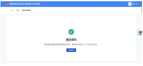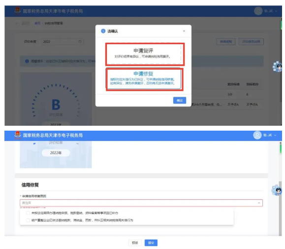 系统会根据当前年度的纳税信用评价情况,自动推荐可办理业务,对于符合修复/复评条件的,系统自动跳转到纳税信用修复/复评功能,纳税人选择修复/复评原因后,提交申请。