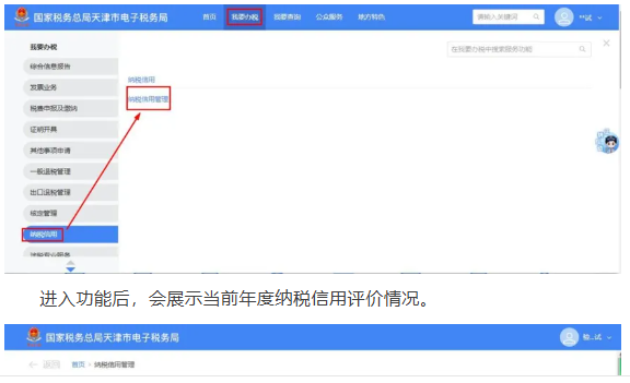 登录新电子税局,点击【我要办税】-【纳税信用】-【纳税信用管理】功能菜单。