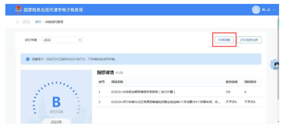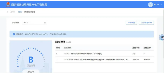 切换年度,可以查看不同年度的纳税信用评价情况,点击申请调整。