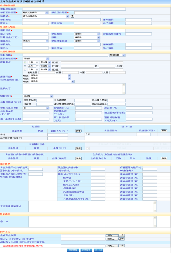红色“*”为必填字段,企业填写内资核准项目申报所需要的具体信息,然后点击下方按钮“保存草稿”或“正式提交”,可以在“办理情况查询”中查看操作相应内容。