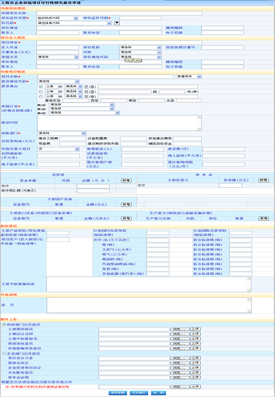 红色“*”为必填字段,企业填写可行性研究报告申报所需要的具体信息,然后点击下方按钮“保存草稿”或“正式提交”,可以在“办理情况查询”中查看操作相应内容。