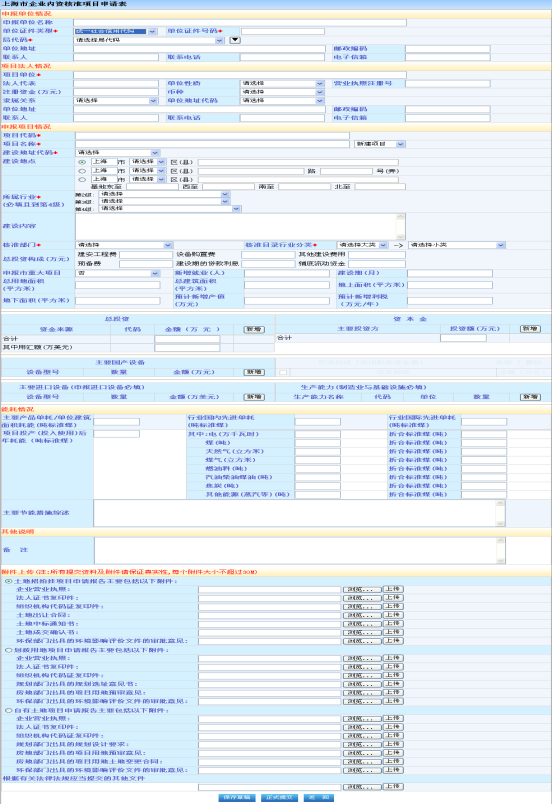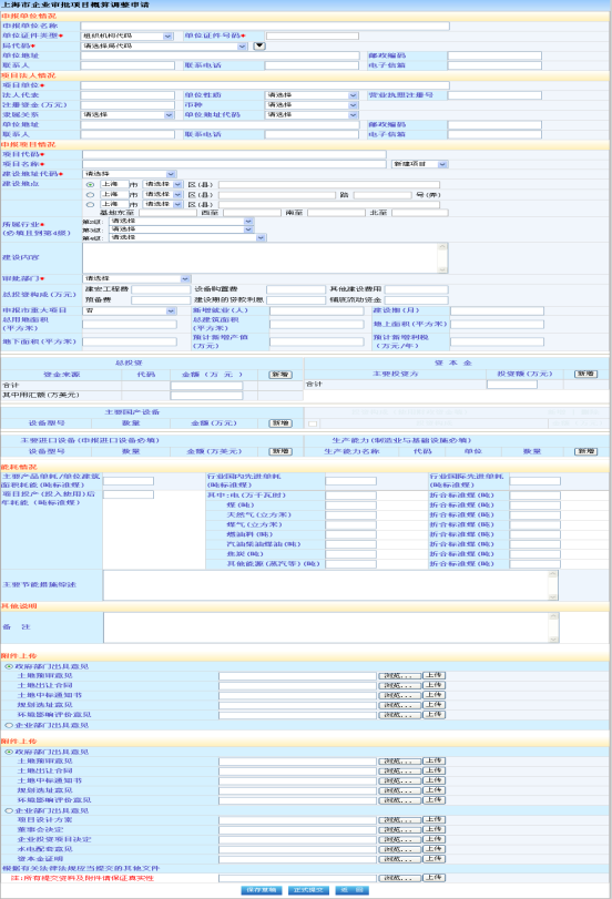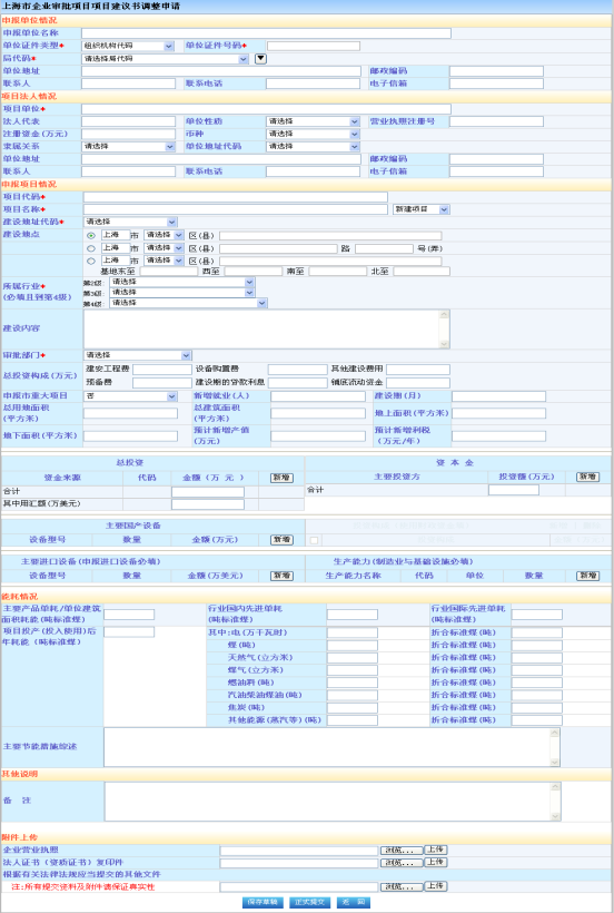红色“*”为必填字段,企业填写内资核准项目变更所需要的具体信息,然后点击下方按钮“保存草稿”或“正式提交”,可以在“办理情况查询”中查看操作相应内容。