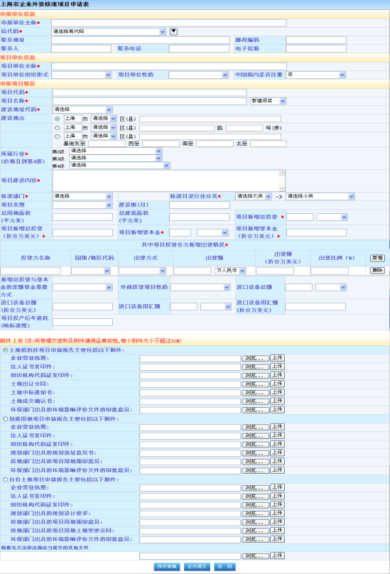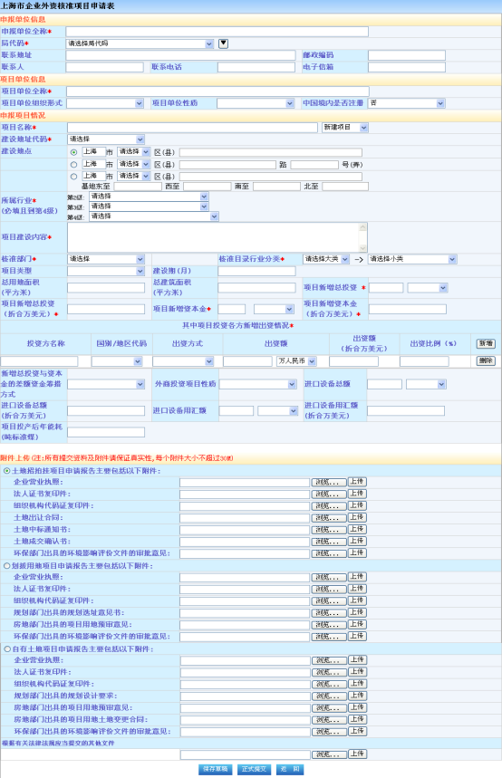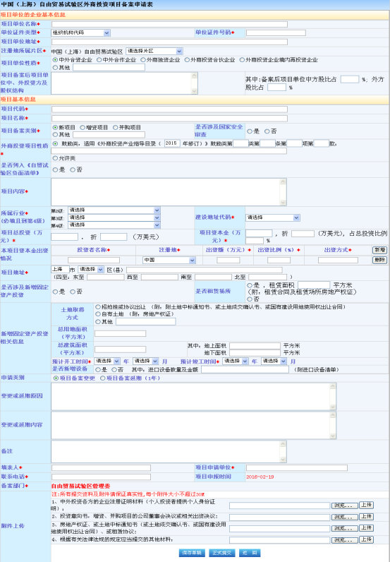 红色“*”为必填字段,企业填写外商投资项目申报或外资投资备案项目变更所需要的具体信息,然后点击下方按钮“保存草稿”或“正式提交”,可以在“办理情况查询”中查看操作相应内容。